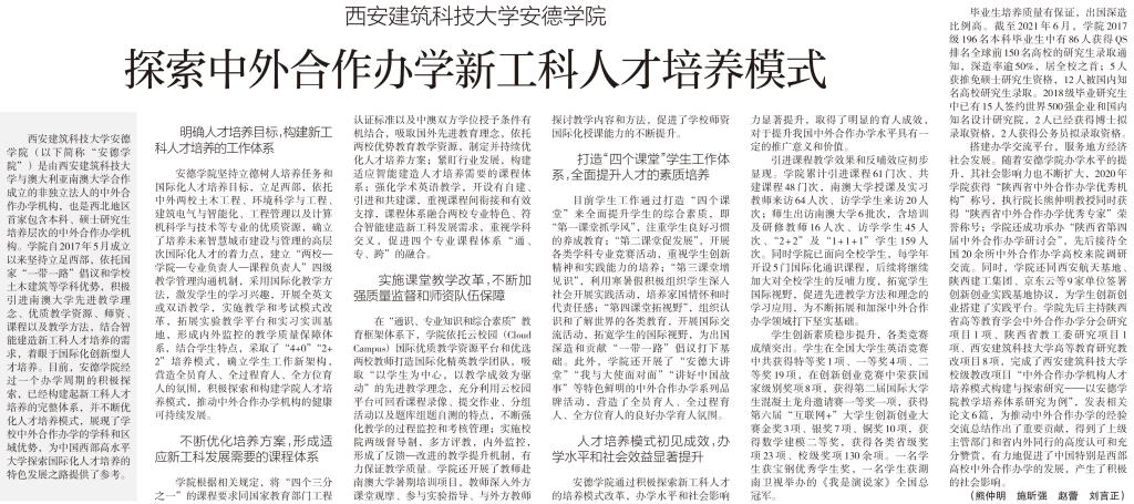 办学水平的提升,其社会影响力也不断扩大,2020年学院获得“陕西省中外合作办学优秀机构”称号,执行院长熊仲明教授同时获得“陕西省中外合作办学优秀专家”荣誉称号;学院还成功承办“陕西省第四届中外合作办学研讨会”,先后接待全国20余所中外合作办学高校来院调研交流。同时,学院还同西安航天基地、陕西建工集团、京东云等9家单位签署创新创业实践基地协议,为学生创新创业搭建了实践平台。学院先后主持陕西省高等教育学会中外合作办学分会研究项目1项、陕西省教工委研究项目1项、午夜影院